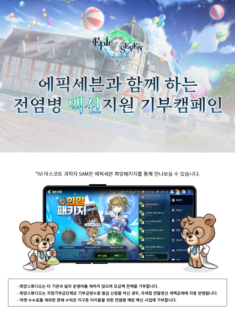 À̹ø ±âºÎÄ·ÆäÀÎÀº Èñ¸Á½ºÆ©µð¿À°¡ Á¦¾ÈÇØ À¯ÀúÂü¿©Çü ÀΰÔÀÓ ¹æ½ÄÀ¸·Î ±âȹµÆ´Ù. À̸¦ À§ÇØ °³¹ß»ç¿¡¼´Â °ÔÀÓ ¾ÆÀÌÅÛ ÆÐŰÁöÀÎ ¡®Èñ¸Á ÆÐŰÁö¡¯¸¦ ¼±º¸¿´´Ù. Èñ¸ÁÆÐŰÁö´Â IVIÀÇ È«º¸ ij¸¯ÅÍ ¿¬±¸¿ø '»ù'ÀÌ ÆêÀ¸·Î Æ÷ÇÔµÆÀ¸¸ç, ±âºÎÄ·ÆäÀο¡ Âü¿©ÇÑ À¯Àúµé¿¡°Ô´Â »ý¸íÀÇ ÀÙ»ç±Í, õ»çÅ׵θ®°¡ Á¦°øµÈ´Ù. °³¹ß»ç ½´ÆÛÅ©¸®¿¡ÀÌÆ¼ºê¸¦ ºñ·ÔÇØ ½º¸¶ÀϰÔÀÌÆ® ¸Þ°¡Æ÷Æ®/½ºÅäºê, ¿ä½ºÅ¸(ÀϺ» ÆÛºí¸®¼Å)µµ ±âºÎ¿¡ µ¿ÂüÇϸç, ÆÐŰÁö ÆÇ¸Å ±Ý¾×Àº Àü¾× ±âºÎ±ÝÀ¸·Î Á¶¼ºµÈ´Ù.