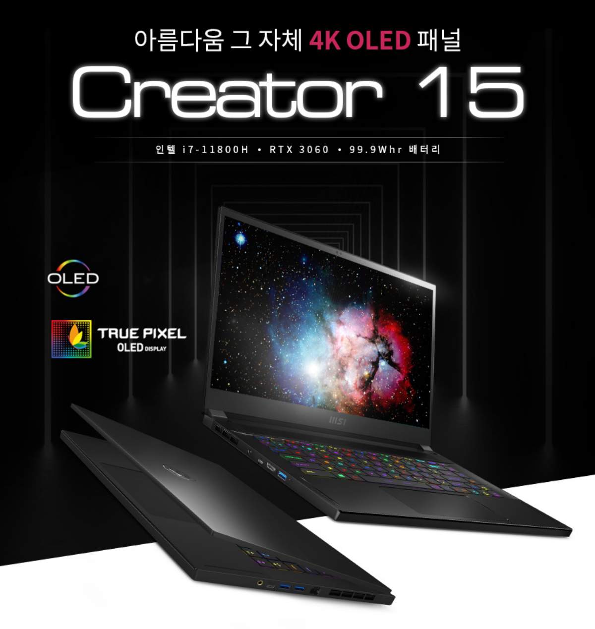 'Å©¸®¿¡ÀÌÅÍ 15 A11UE 4K OLED'´Â ¹é¶óÀÌÆ® ¾øÀÌ ½º½º·Î ºûÀ» ³»´Â OLED µð½ºÇ÷¹À̰¡ Àû¿ëµÆÀ¸¸ç, ÀÏ¹Ý LCDº¸´Ù ¾à 2¹è ´õ ¹àÀº 500´ÏÆ®ÀÇ ¹à±â¸¦ Áö¿øÇÑ´Ù. VESAÀÇ 'µð½ºÇ÷¹ÀÌHDR Æ®·ç ºí·¢ 500' ÀÎÁõÀ» ¹Þ¾Æ 1,000,000:1ÀÇ ¸í¾Ïºñµµ Á¦°øÇÑ´Ù.