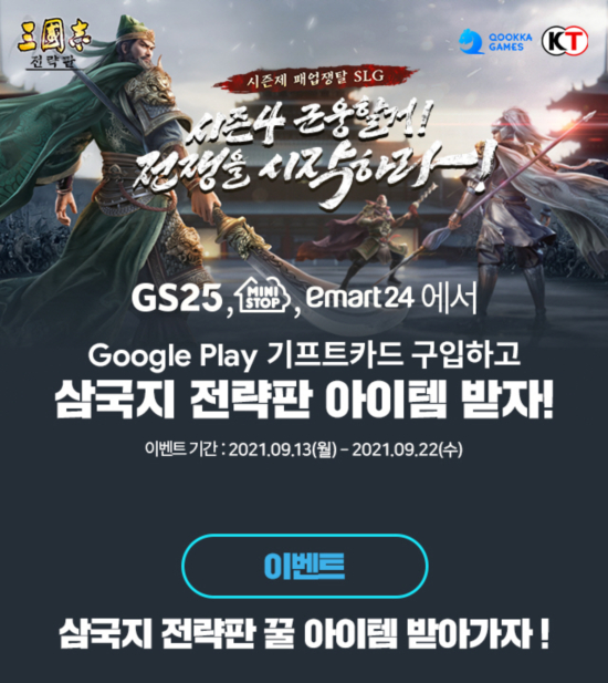 À̹ø Á¦ÈÞ ÇÁ·Î¸ð¼ÇÀº 9¿ù 13ÀϺÎÅÍ 22ÀϱîÁö ÁøÇàµÈ´Ù. ÀÌ¿ëÀÚ´Â À̹ø ÇÁ·Î¸ð¼ÇÀ» ÅëÇØ GS25¿Í ¹Ì´Ï½ºÅ¾, À̸¶Æ®24 ÆíÀÇÁ¡¿¡¼ ±¸±ÛÇ÷¹ÀÌ ±âÇÁƮīµå¸¦ ±¸ÀÔÇÏ°í ¡®»ï±¹Áö Àü·«ÆÇ¡¯ ¾ÆÀÌÅÛÀ» ¹Þ¾Æº¼ ¼ö ÀÖ´Ù.
