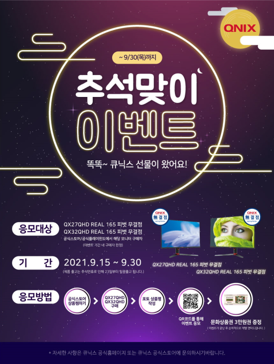 Å¥´Ð½º±×·ìÀº Ãß¼® ¿¬ÈÞ¸¦ ¸ÂÀÌÇÏ¿© Æ÷Åä»óǰÆò À̺¥Æ®¸¦ ÁøÇàÇÑ´Ù°í 9¿ù 17ÀÏ ¹àÇû´Ù. ´ë»ó Á¦Ç°Àº 'QX32QHD REAL 165 Çǹþ ¹«°áÁ¡' °ú 'QX27QHD REAL 165 Çǹþ ¹«°áÁ¡' µÎ Á¦Ç°ÀÌ´Ù.