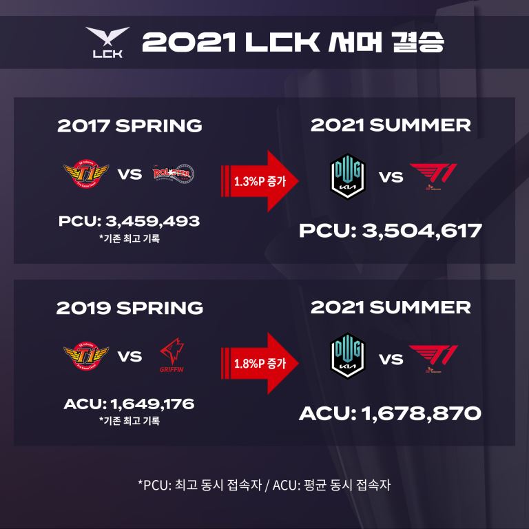 8¿ù 28ÀÏ ´ã¿ø ±â¾Æ¿Í T1ÀÇ ¸Â´ë°á·Î ÁøÇàµÈ 2021 LCK ¼¸Ó °á½ÂÀüÀÇ ÃÖ°íµ¿½Ã½ÃûÀÚ¼ö(PCU, Peak Concurrent User)´Â ¹«·Á 350¸¸ ¿©¸í, Æò±Õ µ¿½Ã½ÃûÀÚ¼ö(ACU, Average Concurrent User)´Â 168¸¸ ¿©¸íÀ¸·Î µÎ ½ÃûÁöÇ¥ ¸ðµÎ ¿ª´ë ÃÖ°í ±â·ÏÀ» °»½ÅÇß´Ù. ±âÁ¸ÀÇ ÃÖ°í PCU´Â 2017³â SKÅÚ·¹ÄÞ T1°ú KT·Ñ½ºÅÍÀÇ ½ºÇÁ¸µ °á½ÂÀüÀÇ 346¸¸À̾úÀ¸¸ç, ACU´Â 2019³â SKÅÚ·¹ÄÞ T1°ú ±×¸®ÇÉÀÇ ½ºÇÁ¸µ °á½ÂÀü ¶§ ±â·ÏµÈ 165¸¸ÀÌ ÃÖ°íÄ¡¿´´Ù.