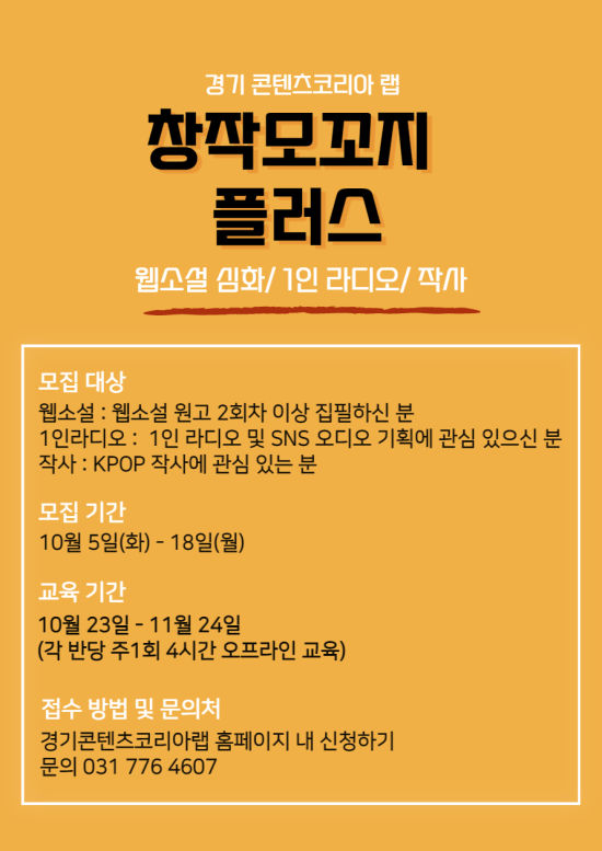 °æ±âÄÜÅÙÃ÷ÁøÈï¿øÀÌ ¹®ÈÄÜÅÙÃ÷ ºÐ¾ß âÀÛÀÚ Áö¿øÀ» À§ÇØ ¿î¿µ ÁßÀÎ °æ±â ÄÜÅÙÃ÷ÄÚ¸®¾Æ ·¦(ÀÌÇÏ °æ±âÄÜ·¦)À» ÅëÇØ ¿À´Â 15ÀÏ(±Ý)±îÁö ¡®Ã¢ÀÛ¸ð²¿Áö Ç÷¯½º¡¯ ±³À°»ýÀ» ¸ðÁýÇÑ´Ù°í ¹àÇû´Ù.