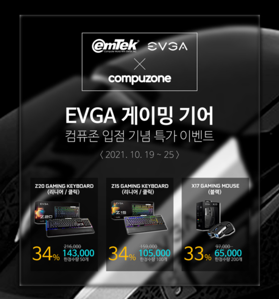 À̹ø °¡°Ý ÇÒÀÎ À̺¥Æ®¸¦ ÁøÇàÇÏ´Â Á¦Ç°µéÀº EVGA °ÔÀÌ¹Ö ±â¾î·Î Z20 RGB ±¤Ãà °ÔÀÌ¹Ö Å°º¸µå (¸®´Ï¾î / Ŭ¸¯) ǰ¸ñº° 50°³, Z15 RGB °ÔÀÌ¹Ö Å°º¸µå (¸®´Ï¾î / Ŭ¸¯) ǰ¸ñº° 100°³, X17 °ÔÀÌ¹Ö ¸¶¿ì½º (ºí·¢) 200°³·Î, ¸ðµÎ ÇÑÁ¤¼ö·®À¸·Î ÇÒÀÎ À̺¥Æ®°¡ Àû¿ëµÈ´Ù.