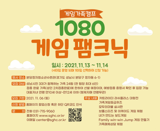 ¡®1080 °ÔÀÓÆÔÅ©´Ð¡¯Àº ¿À´Â 11¿ù 13ÀÏ(Åä)ºÎÅÍ 14ÀÏ(ÀÏ)±îÁö ÀÌÆ² µ¿¾È ºÐ´çÁ¤ÀÚû¼Ò³â¼ö·Ã°ü(°æ±âµµ ¼º³²½Ã ºÐ´ç±¸ Á¤ÀÚµ¿ 6-1)¿¡¼ °³ÃֵȴÙ. ¸¸ 10¼¼ ÀÌ»ó ~ 12¼¼ ÀÌÇÏ ÃʵîÇлý Àڳฦ Æ÷ÇÔÇÑ ¼º³²½Ã °ÅÁÖ 3´ë °¡Á·À» ´ë»óÀ¸·Î Çϸç, Äڷγª19 È®»ê ¹æÁö¸¦ À§ÇÏ¿© 2Â÷ Á¢Á¾À» ¿Ï·áÇÑ °¡Á·(ÀÚ³à Á¦¿Ü)¿¡ ÇÑÇØ ÃÑ 24ÆÀ(ÇÑ ÆÀ´ç ÃÖ¼Ò 3ÀÎ ±âÁØ, ÃÖ´ë 6ÀÎ)ÀÇ °¡Á·À» ¼±¹ßÇÒ ¿¹Á¤ÀÌ´Ù. Ä·ÇÁ´Â ÇÏ·ç µÎ Â÷·Ê 4½Ã°£¾¿ ÁøÇàµÇ¸ç, ȸ´ç 6ÆÀÀÇ °¡Á·ÀÌ Âü¿©Çϵµ·Ï ¿î¿µµÈ´Ù.