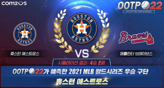 ¸ð¹ÙÀÏ °ÔÀÓ ±â¾÷ ÄÄÅõ½º(´ëÇ¥ ¼ÛÀçÁØ, ÀÌÁÖȯ)ÀÇ ÀÚȸ»ç ¡®¾Æ¿ô ¿Àºê ´õ ÆÄÅ© µðº§·Ó¸ÕÃ÷(Out of the Park Developments)¡¯°¡ °³¹ßÇÏ°í ¼ºñ½ºÇÏ´Â MLB ¶óÀ̼±½º ¾ß±¸°ÔÀÓ ¡®¾Æ¿ô ¿Àºê ´õ ÆÄÅ© º£À̽ºº¼(ÀÌÇÏ OOTP º£À̽ºº¼)¡¯ÀÌ ¿ÃÇØ MLB¿ùµå½Ã¸®Áî ¿ì½ÂÆÀÀ» ¿¹ÃøÇÏ´Â ½Ã¹Ä·¹À̼ÇÀ» ÁøÇàÇÏ°í ±× °á°ú¸¦ °ø°³Çß´Ù.