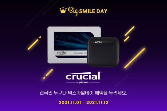À̺¥Æ® ´ë»ó Á¦Ç°Àº ¸¶ÀÌÅ©·Ð Å©·ç¼È SSD P5¿Í MX500, ¿ÜÀå SSD X6´Ù. ºò½º¸¶Àϵ¥À̰¡ ¿¸®´Â G¸¶Äϰú ¿Á¼Ç¿¡¼ ÄíÆùÀ» Àû¿ëÇϸé 1TB ±âÁØ P5 13¸¸7õ¿ø´ë, MX500 10¸¸2õ¿ø, X6 9¸¸9õ¿ø¿¡ ±¸ÀÔÇÒ ¼ö ÀÖ´Ù. ÃÖ´ë 30%ÀÇ ÇÒÀÎ ÇýÅÃÀ» Á¦°øÇÏ´Â À̹ø Çà»ç´Â 11¿ù 1ÀϺÎÅÍ 12ÀϱîÁö ÁøÇàÇÑ´Ù.