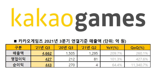 [īī¿À°ÔÀÓÁî] 2021³â 3Q ½ÇÀû ¹ßÇ¥, ¸ÅÃâ Àü³â µ¿±â ´ëºñ 210% Áõ°¡ |