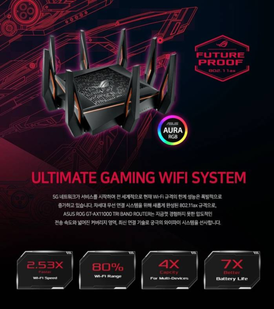 Çà»ç ´ë»ó ¸ðµ¨ÀÎ ASUS ROG Rapture GT-AX11000 À¯¹«¼± °øÀ¯±â´Â ÃÖ½ÅÀÇ Wi-Fi 6 (802.11ax) ±Ô°ÝÀ» Áö¿øÇÏ´Â ASUS °øÀ¯±âÀÇ ÇÏÀÌ¿£µå ¶óÀξ÷À¸·Î¼, ³¡ÆÇ¿Õ °øÀ¯±â ´Ù¿î 1.8GHz Ŭ·°ÀÇ ¾ÐµµÀûÀÎ Äõµå ÄÚ¾î ÇÁ·Î¼¼¼ žÀç¿Í 1GB RAM, 256MB Ç÷¡½Ã žÀç·Î ÃÖ´ë 11000Mbps À̶ó´Â °æÀ̷οî Wi-Fi ¼Óµµ¸¦ Á¦°øÇÑ´Ù.