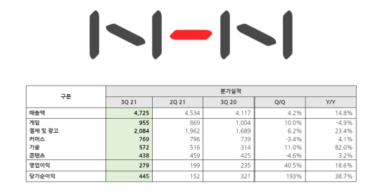 NHNÀÇ ¿¬°á±âÁØ 2021³â 3ºÐ±â ¸ÅÃâÀº Àü³â µ¿±â ´ëºñ 14.8%, Àü ºÐ±â ´ëºñ 4.2% Áõ°¡ÇÑ 4,725¾ï¿ø, ¿µ¾÷ÀÌÀÍÀº 279¾ï¿ø, ´ç±â¼øÀÌÀÍÀº 445¾ï¿øÀ» ±â·ÏÇß´Ù.