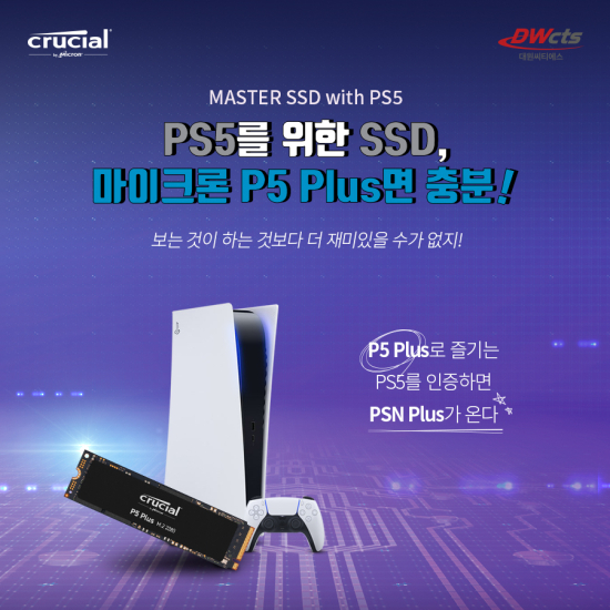 ´ë¿ø¾¾Æ¼¿¡½º´Â ¸¶ÀÌÅ©·Ð Å©·ç¼È(Micron Crucial) P5 Plus¿Í Ç÷¹À̽ºÅ×À̼Ç5(ÀÌÇÏ PS5) ÀÌ¿ëÀÚ¿¡°Ô PSN Plus 12°³¿ù ÀÌ¿ë±ÇÀ» ÁõÁ¤ÇÏ´Â ¡®MASTER SSD with PS5¡¯ À̺¥Æ®¸¦ °³ÃÖÇÑ´Ù°í ¹àÇû´Ù.