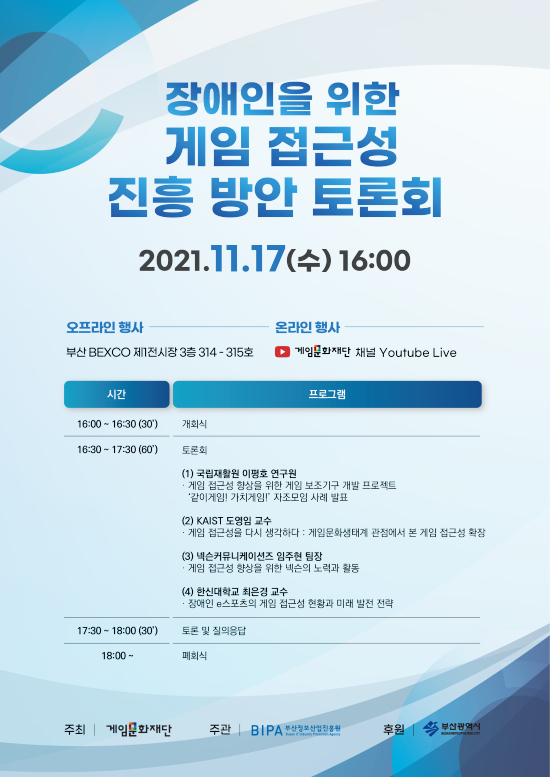 °ÔÀÓ¹®ÈÀç´ÜÀº 17ÀÏ(¼ö) ¿ÀÈÄ 4½ÃºÎÅÍ Áö½ºÅ¸ Çà»çÀåÀÎ ºÎ»ê BEXCO Á¦1Àü½ÃÀå¿¡¼ ¡¸Àå¾ÖÀÎÀ» À§ÇÑ °ÔÀÓ Á¢±Ù¼º ÁøÈï ¹æ¾È Åä·Ðȸ¡¹¸¦ °³ÃÖÇÑ´Ù°í ¹àÇû´Ù.