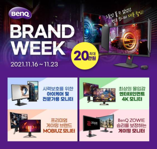 º¥Å¥´Â º¥Å¥ ¸ð´ÏÅÍ °ø½Ä ¼öÀÔ¿ø ÇÇÄ¡¹ë¸®¿Í ÇÔ²² º¥Å¥ ºê·£µå À§Å©(BenQ Brand Week) Çà»ç¸¦ ÁøÇàÇÑ´Ù°í ¹àÇû´Ù. º¥Å¥ ºê·£µå À§Å©´Â ±¹³» ÁÖ¿ä ¿Â¶óÀÎ ¼îÇθô¿¡¼ 11¿ù 16ÀϺÎÅÍ 11¿ù 23ÀÏ ¿ÀÀü 10½Ã±îÁö ÀÏÁÖÀϵ¿¾È ÁøÇàµÇ¸ç, ½Ã·Âº¸È£ ¸ð´ÏÅͺÎÅÍ °ÔÀÌ¹Ö ¸ð´ÏÅͱîÁö Á¦Ç° 19Á¾À» ÃÖ´ë 20¸¸¿ø ÇÒÀÎÇÏ´Â Çà»çÀÌ´Ù.