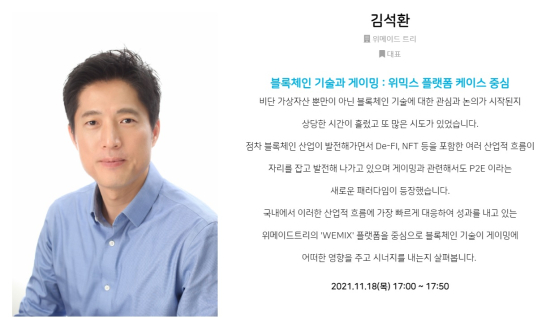 11¿ù 18ÀÏ ¸ñ¿äÀÏ¿¡´Â ±è¼®È¯ À§¸ÞÀÌµåÆ®¸® ´ëÇ¥°¡ 'ºí·ÏüÀÎ ±â¼ú°ú °ÔÀ̹Ö: À§¹Í½º Ç÷§Æû ÄÉÀ̽º Áß½É'À̶ó´Â ÁÖÁ¦·Î °¿¬À» ÁøÇàÇÑ´Ù. °¿¬¿¡¼´Â 'Play to Earn(Ç÷¹ÀÌ Åõ ¾ð, P2E)'¶ó´Â »õ·Î¿î ÆÐ·¯´ÙÀÓ°ú ´õºÒ¿¡ ºí·ÏüÀÎ ±â¼úÀÌ °ÔÀֿ̹¡ ¾î¶² ¿µÇâÀ» ÁÖ´ÂÁö¸¦ »ìÆìº»´Ù.