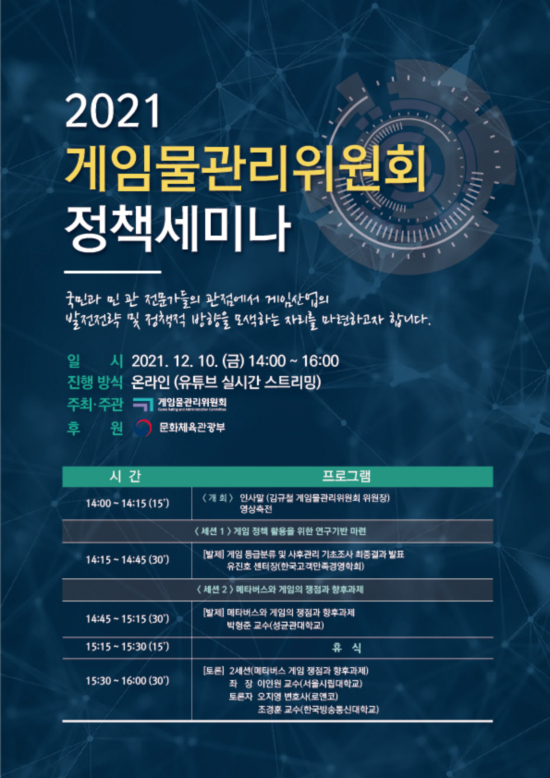 °ÔÀÓ¹°°ü¸®À§¿øÈ¸´Â 10ÀÏ(±Ý) ¿ÀÈÄ 2½ÃºÎÅÍ ¡®2021 °ÔÀÓÁ¤Ã¥ ¼¼¹Ì³ª¡¯¸¦ °³ÃÖÇÑ´Ù. °ÔÀÓÀ§ ÁÖÃÖ/ÁÖ°ü, ¹®ÈüÀ°°ü±¤ºÎ ÈÄ¿øÀ¸·Î ÁøÇàµÇ´Â À̹ø ¼¼¹Ì³ª´Â Äڷγª-19 ¿¹¹æÀ» À§ÇØ À¯Æ©ºê ½Ç½Ã°£ ¿Â¶óÀÎ Áß°è·Î °³ÃֵȴÙ.