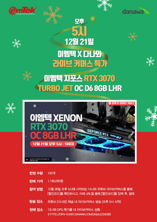 ´Ù³ª¿Í ¶óÀ̺ê Ä¿¸Ó½º ¹æ¼ÛÀº 12¿ù 21ÀÏ ¿ÀÈÄ 5½ÃºÎÅÍ ½ÃÀ۵Ǹç, ¶óÀÌºê ¹æ¼Û¿¡¼ ³ëÃâµÇ´Â ÇÒÀÎ Äڵ带 È®ÀÎÇϰí, ´Ù³ª¿Í DPG Ư°¡¸ô ³» ÀÌ¿¥ÅØ ÁöÆ÷½º RTX 3070 TURBO JET OC D6 8GB LHR ¶óÀ̺êÄ¿¸Ó½º »óǰ ÆÇ¸Å ÆäÀÌÁö¿¡ ÇÒÀÎ Äڵ带 ÀÔ·ÂÇÑ ÈÄ, ±¸¸ÅÇÏ¸é µÈ´Ù.