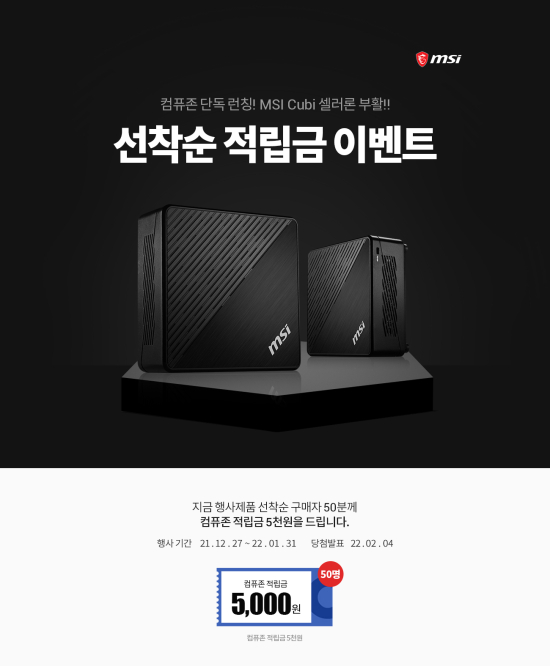 2021³â 12¿ù 27ÀϺÎÅÍ 2022³â 1¿ù 31ÀϱîÁö ÇÑÁ¤ ¼ö·®À¸·Î ÁøÇàµÇ´Â À̹ø Çà»ç´Â ¡®MSI Å¥ºñ5 C5205U¡¯ ±¸¸ÅÀÚ ¼±Âø¼ø 50¸í¿¡ ÄÄÇ»Á¸ Àû¸³±Ý 5,000¿øÀ» ÁõÁ¤ÇÑ´Ù.