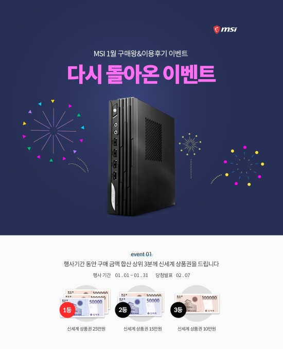 2022³â 1¿ù 1ÀϺÎÅÍ 2022³â 1¿ù 31ÀϱîÁö ÇÑÁ¤ ¼ö·®À¸·Î ÁøÇàµÇ´Â À̹ø Çà»ç¿¡¼ MSI´Â, ¡®MSI ¹Ì´Ï DP21¡¯ÀÇ ±¸¸ÅÀÚ¸¦ ´ë»óÀ¸·Î, ±¸¸ÅÇÑ ±Ý¾×À» ÇÕ»êÇÏ¿© »óÀ§ 3Àο¡°Ô ½Å¼¼°è »óǰ±ÇÀ» Â÷µî Áö±ÞÇÑ´Ù. ¶ÇÇÑ Á¦Ç°ÀÇ Èı⸦ ÀÛ¼ºÇÑ ¸ðµç ±¸¸ÅÀÚ¸¦ ´ë»óÀ¸·Î ÄÄÇ»Á¸ Àû¸³±ÝÀ» Àü¿ø Áö±ÞÇÑ´Ù.