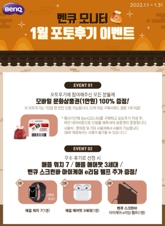 º¥Å¥´Â º¥Å¥ ¸ð´ÏÅÍ °ø½Ä ¼öÀÔ¿ø ÇÇÄ¡¹ë¸®¿Í ÇÔ²² 1¿ù ÀÚ»çÀÇ ¸ð´ÏÅÍ ±¸¸ÅÀÚ¸¦ ´ë»óÀ¸·Î ¸ð¹ÙÀÏ ¹®È»óǰ±Ç°ú ¾ÖÇà ¿öÄ¡7, ¿¡¾îÆÌ 3¼¼´ë, º¥Å¥ ½ºÅ©¸°¹Ù e¸®µù ·¥ÇÁ¸¦ ÁõÁ¤ÇÏ´Â Æ÷ÅäÈıâ À̺¥Æ®¸¦ ÁøÇàÇϸç, ¸ð´ÏÅÍ Á¦Ç°±ºº°·Î Æ÷ÅäÈıâ Çà»ç¿Í Áߺ¹À¸·Î Âü¿© °¡´ÉÇÑ »çÀºÇ° ÁõÁ¤ Çà»ç¸¦ ÁøÇàÇÑ´Ù°í ¹àÇû´Ù.