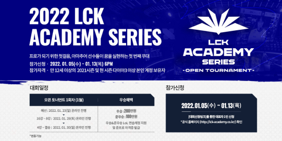 2022 ¾ÆÄ«µ¥¹Ì ½Ã¸®Áî ¿ÀÇÂÅä³Ê¸ÕÆ® 1ȸÂ÷´Â ¿À´Â 23ÀÏ(ÀÏ)ºÎÅÍ ¿¹¼±À» Ä¡¸¥´Ù. ¸¸ 12¼¼ ÀÌ»ó 2021½ÃÁð ¹× 2022½ÃÁð ´ÙÀ̾Æ3 ÀÌ»óÀÎ º»ÀÎ °èÁ¤À» ¼ÒÀ¯Çϰí ÀÖÀ¸¸é Âü°¡½ÅûÀ» ÇÒ ¼ö ÀÖÀ¸¸ç, 5¸íÀÌ ÆÀÀ» ÀÌ·ï¼ ½ÅûÇÏ¸é µÈ´Ù. ´Ü, ÃÖ±Ù 6°³¿ù ³»¿¡ LCK ¹× LCK 縰Àú½º ¸®±×, Ÿ Áö¿ª ÇÁ·Î¸®±×¿¡ ÃâÀüÇÒ ÀÌ·ÂÀÌ ÀÖ´Â °æ¿ì¿¡´Â Âü°¡°¡ Á¦ÇѵȴÙ.