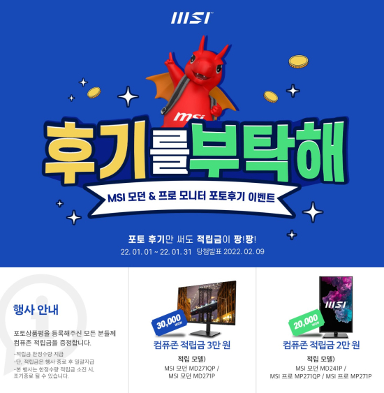 2022³â 1¿ù 1ÀϺÎÅÍ 2022³â 1¿ù 31ÀϱîÁö ÁøÇàµÇ´Â À̹ø Çà»ç¿¡¼´Â MSI ¸ð´ø ¹× ÇÁ·Î ½Ã¸®Áî ¶óÀξ÷ °¡¿îµ¥ ¸ÖƼ ½ºÅĵ带 žÀç Á¦Ç°À» ´ë»óÀ¸·Î ÃÖ´ë 3¸¸ ¿ø »ó´çÀÇ ÄÄÇ»Á¸ Àû¸³±ÝÀ» ÁõÁ¤ÇÏ´Â Çà»çÀÌ´Ù.