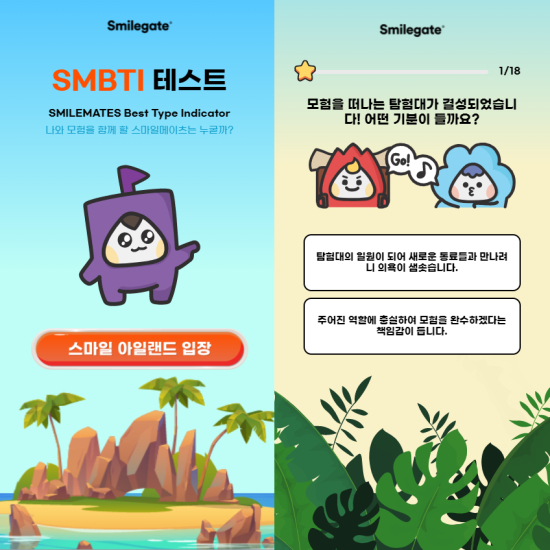 SMBTI(Smilemates Best Type Indicator)´Â ½º¸¶ÀϰÔÀÌÆ®°¡ ÁöÇâÇÏ´Â ´Ù¾çÇÑ °¡Ä¡¸¦ ÀǹÌÇϴ ij¸¯ÅÍ ¡®½º¸¶ÀϸÞÀÌÃ÷ (Smilemates)¡¯¸¦ Ȱ¿ëÇÏ¿©, ±¸¼º¿øµéÀÌ ±×·ì¹®È¸¦ Ä£¼÷Çϰí Èï¹Ì·Ó°Ô °ø°¨ÇÒ ¼ö ÀÖµµ·Ï °³¹ßÇÑ ÇнÀµµ±¸ÀÌ´Ù. ¡®Çٽɰ¡Ä¡¡¯¶ó´Â ¾î°¨ÀÌ ÁÖ´Â ¾î·Æ°í µüµüÇÏ´Ù´Â ¼±ÀÔ°ß¿¡¼ ¹þ¾î³ª, Âü¿©ÀÚÀÇ ¼±ÅÃÀ¸·Î ´Ù¾çÇÑ °á°ú°¡ µµÃâ µÉ ¼ö ÀÖµµ·Ï ÀÎÅÍ·¢Æ¼ºê ÄÜÅÙÃ÷ Çü½ÄÀ¸·Î ¼³°èÇß´Ù. ¶ÇÇÑ ¡®½º¸¶ÀÏ ¾ÆÀÏ·£µå¡¯¶ó´Â °¡»ó ¼¼°è°üÀ» ¹è°æÀ¸·Î ÆîÃÄÁö´Â ¸ðÇè ÄܼÁÆ®¿Í °ÔÀÓ ¿ä¼Ò¸¦ ¹Ý¿µÇÏ¿© ¸ôÀÔ°¨À» °ÈÇß´Ù.
