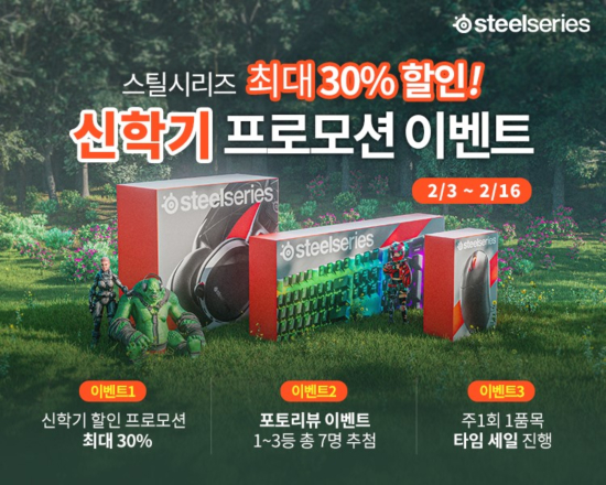 À̹ø ÇÁ·Î¸ð¼ÇÀº 2¿ù 3ÀϺÎÅÍ 16ÀϱîÁö ÃÑ 2ÁÖ°£ ÁøÇàµÇ¸ç, °ÔÀÌ¹Ö Çìµå¼Â, °ÔÀÌ¹Ö ¸¶¿ì½º, °ÔÀÌ¹Ö Å°º¸µå µî ½ºÆ¿½Ã¸®ÁîÀÇ Àαâ ǰ¸ñÀ» ÃÖ´ë 30%±îÁö ÇÒÀÎµÈ °¡°ÝÀ¸·Î ¸¸³ªº¼ ¼ö ÀÖ´Ù. ÇÁ·Î¸ð¼Ç ´ë»ó Á¦Ç°Àº ¡ã°ÔÀ̹ÖÇìµå¼Â 9Á¾ (Arctis Pro Wireless,Arctis Prime, Arctis 5 µî) ¡ã°ÔÀÌ¹Ö ¸¶¿ì½º 6Á¾ (Prime, Rival 5, Sensei Ten, Rival 3µî) ¡ã°ÔÀÌ¹Ö Å°º¸µå5Á¾(Apex Pro, Apex 7, Apex 3µî) ¡ãQCK ¸¶¿ì½ºÆÐµå 4Á¾ µî ÃÑ 25°³ Á¦Ç°ÀÌ´Ù.