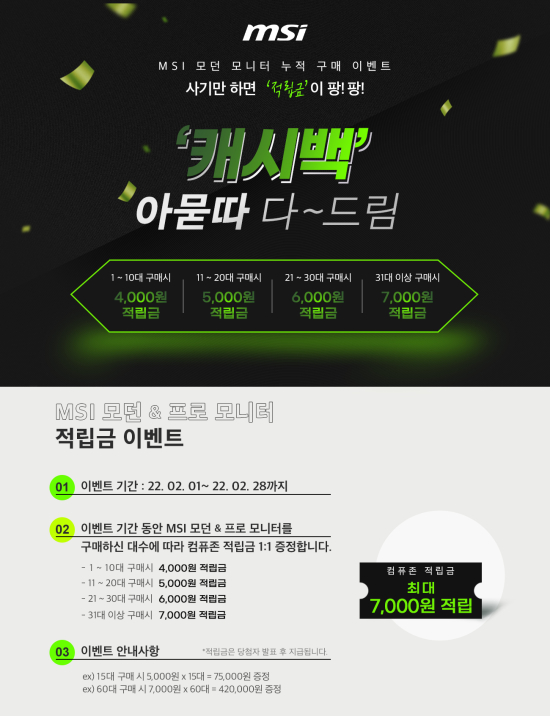 Àû¸³±Ý Áö±ÞÀº 1~10´ë, 11~20´ë, 21~30´ë, 31´ë ÀÌ»óÀÏ ¶§ °¢°¢ 4,000¿ø 5,000¿ø 6,000¿ø 7,000¿ø¾¿ ´Ü°èÀûÀ¸·Î Àû¸³±ÝÀÇ ¾×¼ö°¡ ³ô¾ÆÁö´Â ¹æ½ÄÀÌ´Ù. ƯÈ÷ ¸ð´ÏÅÍ ±¸¸Å ´ë¼ö¿¡ µû¶ó 1:1 ºñÀ²·Î Àû¸³±ÝÀ» Áö±ÞÇϱ⠶§¹®¿¡ MSI ¸ð´ÏÅÍ ±¸¸Å ´ë¼ö°¡ Áõ°¡ÇÒ¼ö·Ï Áö±ÞµÇ´Â Àû¸³±Ý ¿ª½Ã ³ô¾ÆÁú ¼ö ÀÖ´Ù. °¡·É, MSI Á¦Ç° ´ë»ó ¸ð´ÏÅ͸¦ 15´ë ±¸¸ÅÇßÀ» ¶§ 5,000¿ø¿¡ Àû¸³±ÝÀÌ 15´ë ¸ðµÎ 1:1·Î Àû¿ëµÇ¾î ÃÑ 75,000¿øÀÇ Àû¸³±ÝÀ» ȹµæÇÒ ¼ö ÀÖ´Ù.