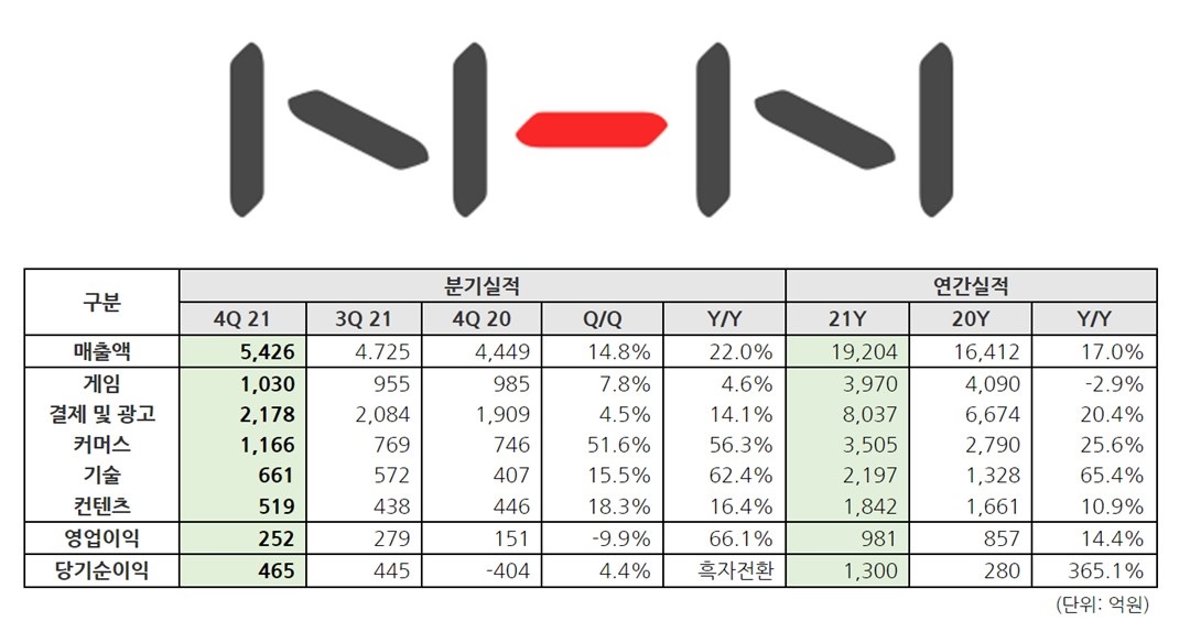 NHNÀÇ ¿¬°á±âÁØ 2021³â 4ºÐ±â ¸ÅÃâÀº Àü³â µ¿±â ´ëºñ 22.0%, ÀüºÐ±â ´ëºñ 14.8% Áõ°¡ÇÑ 5,426¾ï¿øÀ» ±â·ÏÇß´Ù. ¿µ¾÷ÀÌÀÍÀº 252¾ï¿øÀ¸·Î Àü³â µ¿±â ´ëºñ 66.1% Áõ°¡ÇßÀ¸¸ç, ´ç±â¼øÀÌÀÍÀº 465¾ï¿øÀ¸·Î Àü³â µ¿±â ´ëºñ ÈæÀÚÀüȯÇß´Ù.