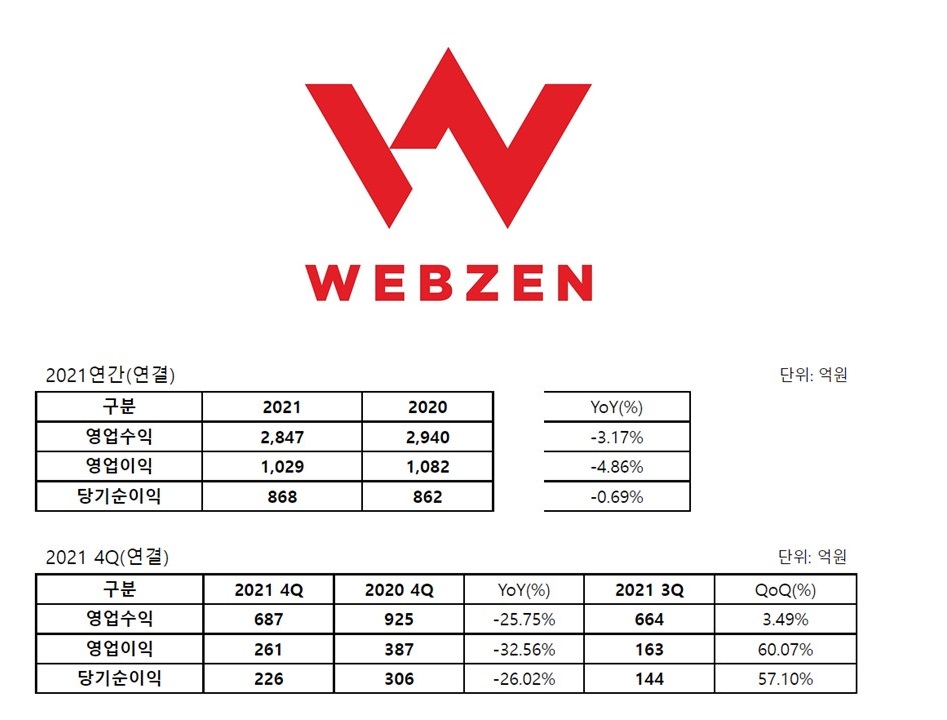 ¿À´Ã(2¿ù 9ÀÏ) °ø½ÃµÈ À¥Á¨ÀÇ 2021³â ½ÇÀûÀº ¿µ¾÷¼öÀÍÀÌ 2847¾ï¿øÀ¸·Î Àü³â(2020³â) ´ëºñ 3.17% °¨¼ÒÇßÀ¸¸ç, ¿µ¾÷ÀÌÀÍÀº 1029¾ï¿ø, ´ç±â¼øÀÌÀÍÀº 868¾ï¿øÀ¸·Î °¢°¢ 4.86%, 0.69% ÁÙ¾ú´Ù.