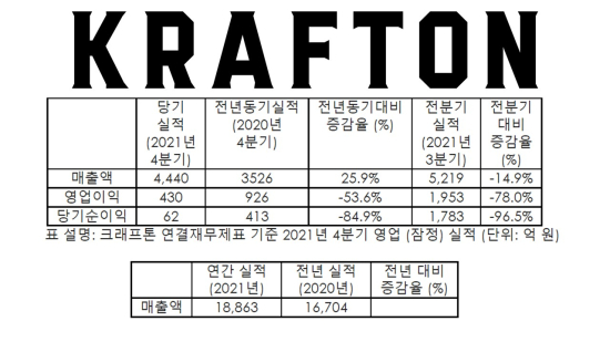 Å©·¡ÇÁÅæÀÇ 2021³â ÇÑ ÇØ ¸ÅÃâ¾×Àº Çѱ¹Ã¤Åñ¹Á¦È¸°è±âÁØ(K-IFRS)À» Àû¿ëÇÑ ¿¬°á À繫Á¦Ç¥ ±âÁØÀ¸·Î 1Á¶ 8,863¾ï ¿ø, ¿µ¾÷ÀÌÀÍ 6,396¾ï ¿ø ´ç±â¼øÀÌÀÍ 5,199¾ï ¿øÀ¸·Î, Àü³â ´ëºñ 13% ¼ºÀåÇÑ ¿ª´ë ÃÖ´ë ¸ÅÃâ¾×À» ´Þ¼ºÇß´Ù. ¿¬°£ ÇØ¿Ü ¸ÅÃâ ºñÁßÀº 94%¸¦ ´Þ¼ºÇÏ¸ç ±Û·Î¹ú °ÔÀÓ»ç·Î¼ÀÇ ¿µÇâ·ÂÀ» °ÈÇß´Ù. ´ëÁÖÁÖ º¸À¯ ÁÖ½ÄÀÇ ¹«»óÁõ¿© ºñ¿ë Áß 609¾ï¿øÀº ȸ»çÀÇ ÁöÃâºñ¿ëÀÌ ¾Æ´ÏÁö¸¸ ȸ°è»ó ºñ¿ëÀ¸·Î 2021³â¿¡ ¹Ý¿µµÇ¾ú°í, À̸¦ °¨¾ÈÇϸé 2³â ¿¬¼Ó 7,000¾ï ¿ø´ë ¿µ¾÷ÀÌÀÍÀ» ´Þ¼ºÇß´Ù. 2021³â 4ºÐ±â ¸ÅÃâ¾×Àº 4,440¾ï¿ø, ¿µ¾÷ÀÌÀÍ 430¾ï ¿ø, ´ç±â¼øÀÌÀÍ 62¾ï ¿øÀ» ±â·ÏÇØ, Àü³â µ¿±â ´ëºñ 26% ¼ºÀå¼¼¸¦ º¸¿´´Ù.