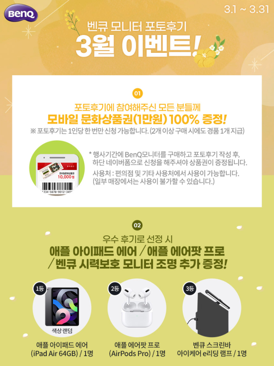À̹ø Æ÷ÅäÈıâ´Â 3¿ù ÇÑ ´Þ °£ º¥Å¥ ¸ð´ÏÅ͸¦ ±¸ÀÔÇÏ°í »çÁøÀ» Æ÷ÇÔÇÑ ±¸¸ÅÈı⸦ ÀÛ¼ºÇÑ ¸ðµç ºÐµé¿¡°Ô ¸ð¹ÙÀÏ ¹®È»óǰ±Ç(1¸¸¿ø±Ç)À» ÁõÁ¤Çϰí, 1µî Èıâ·Î ¼±Á¤µÈ ºÐ¿¡°Ô´Â ¾ÖÇà ¾ÆÀÌÆÐµå ¿¡¾î, 2µî¿¡°Ô´Â ¾ÖÇà ¿¡¾îÆÌ ÇÁ·Î, 3µîÀº ´«ÀÌ ÆíÇÑ ¸ð´ÏÅÍÁ¶¸í ¡®º¥Å¥ ½ºÅ©¸°¹Ù ¾ÆÀÌÄɾî e¸®µù ·¥ÇÁ¡¯¸¦ Ãß°¡·Î ÁõÁ¤ÇÏ´Â Çà»çÀÌ´Ù.