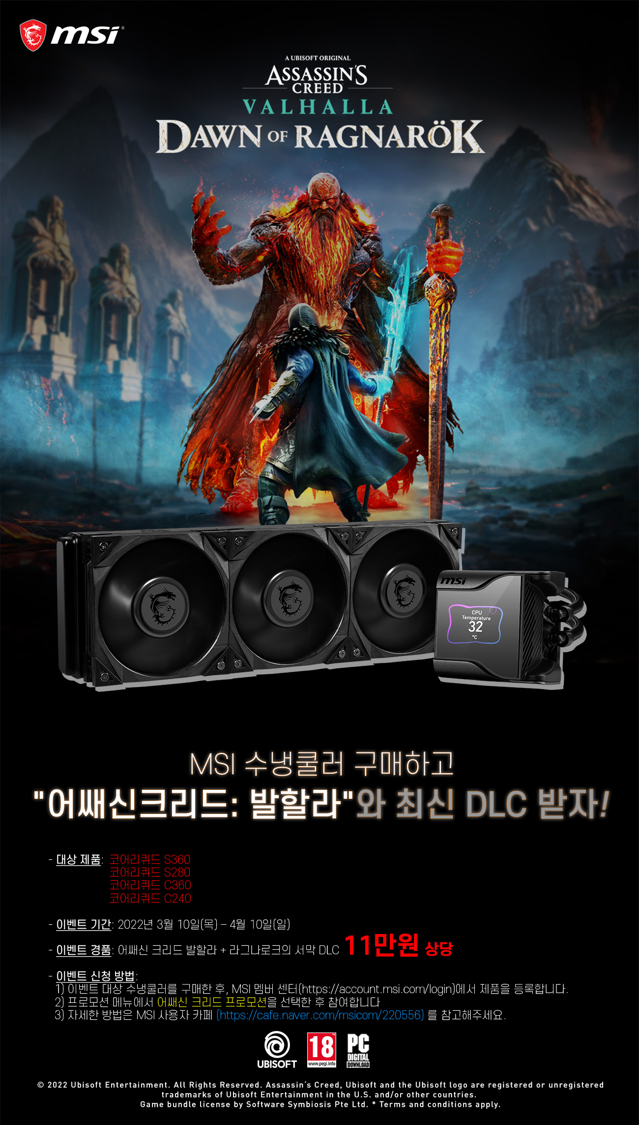 º» À̺¥Æ®´Â 3¿ù 10ÀÏ(¸ñ)ºÎÅÍ 4¿ù 10ÀÏ(ÀÏ)±îÁö ÁøÇàÇϸç, ÇØ´ç ±â°£ ³» MSI ¼ö³ÃÄ𷯸¦ ±¸¸ÅÇϸé Àα⠰ÔÀÓ '¾î½Ø½ÅÅ©¸®µå ¹ßÇÒ¶ó' ¹× ÃֽŠDLC '¶ó±×³ª·ÎÅ©ÀÇ ¼¸·' µî 11¸¸¿ø »ó´çÀÇ °ÔÀÓ Äڵ带 ÁõÁ¤ÇÑ´Ù.