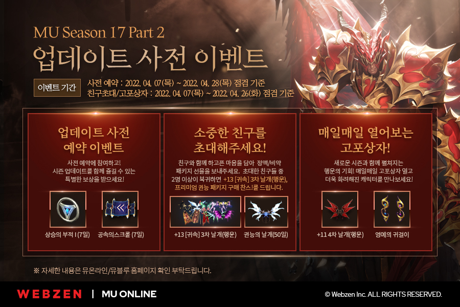 À¥Á¨Àº ¿À´Â 4¿ù 28ÀÏ(¸ñ)±îÁö ¡®½ÃÁð17-2 ¾÷µ¥ÀÌÆ®¡¯ÀÇ À̺¥Æ® ÆäÀÌÁö¿¡¼ »çÀü ¿¹¾à ½ÅûÀ» ¿Ï·áÇÑ È¸¿ø¿¡°Ô ij¸¯ÅÍ ¼ºÀå¿¡ À¯¿ëÇÑ ¾ÆÀÌÅÛ ¡®»ó½ÂÀÇ ºÎÀû I(7ÀÏ)¡¯, ¡®°ø¼ÓÀǽºÅ©·Ñ(7ÀÏ)¡¯À» Áö±ÞÇÑ´Ù. »çÀü ¿¹¾à¿¡ Âü¿©ÇÑ È¸¿ø Áß Ãß÷À» ÅëÇØ 30¸í¿¡°Ô ¡®³×³×ġŲ ±âÇÁƼÄÜ¡¯À» ¼±¹°ÇÑ´Ù.