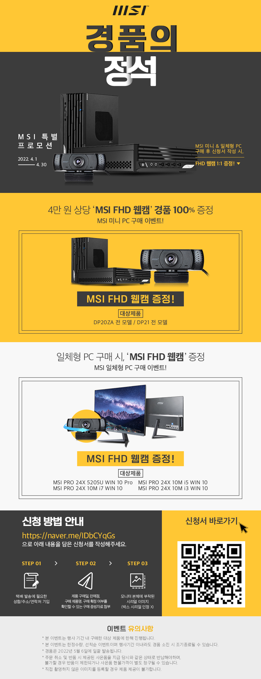 4¿ù 30ÀϱîÁö ÁøÇàÇÏ´Â À̹ø À̺¥Æ®´Â MSIÀÇ ¹Ì´ÏPC ¶Ç´Â ÀÏüÇüPC¸¦ ±¸¸ÅÇÑ ÈÄ ÁöÁ¤µÈ ¾ç½Ä¿¡ ¸ÂÃç ½Åû¼ ÀÛ¼º ½Ã FHD À¥Ä·À» ÁõÁ¤ÇÑ´Ù. ´ë»óÁ¦Ç°Àº Àα⠹̴ÏPCÀÎ ¡®MSI ¹Ì´Ï DP20ZA ½Ã¸®Á ¹× ¡®MSI ¹Ì´ÏDP21 ½Ã¸®Á¿Í ÀÏüÇüPC ¡®MSI ÇÁ·Î 24X ½Ã¸®ÁÀÌ´Ù.