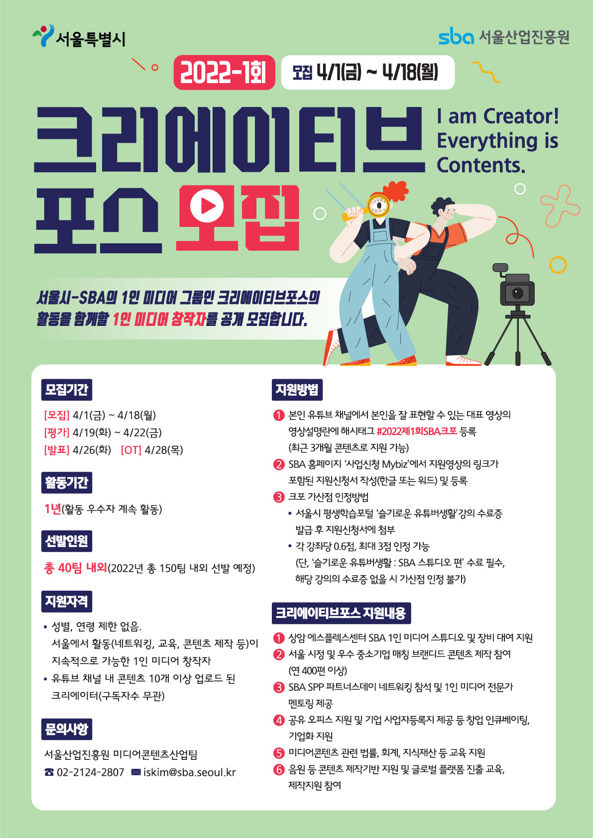 ¼¿ï½Ã¿Í ¼¿ï½ÃÀÇ Áß¼Ò±â¾÷°ú ÄÜÅÙÃ÷ âÀÛÀÚÀÇ °æÀï·ÂÀ» ¸¸µå´Â Áß¼Ò±â¾÷ Áö¿ø ±â°ü ¼¿ï»ê¾÷ÁøÈï¿øÀº 1ÀÎ ¹Ìµð¾î Å©¸®¿¡ÀÌÅÍ ±×·ì ¡®Å©¸®¿¡ÀÌÆ¼ºêÆ÷½º¡¯ 2022³â Á¦1Â÷ ¸ðÁýÀ» ÇÑ´Ù°í ¹àÇû´Ù.