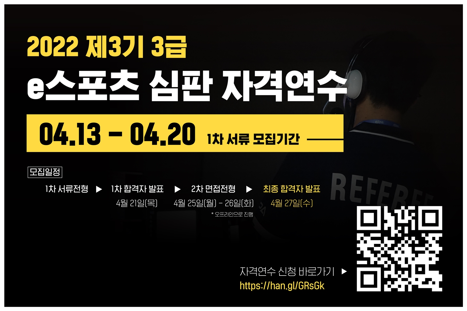 Çѱ¹e½ºÆ÷Ã÷Çùȸ°¡ ¡®Á¦3±â 3±Þ e½ºÆ÷Ã÷ ½ÉÆÇ ÀÚ°Ý ¿¬¼ö¡¯ ±³À°»ýÀ» 13ÀÏ(¼ö)ºÎÅÍ ¸ðÁýÇÑ´Ù.
