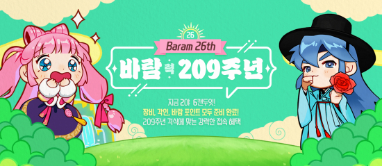 26³âÀ» °ÔÀÓ ³» ½Ã°£ ´ÜÀ§·Î Ç¥ÇöÇÑ ¡®¹Ù¶÷·Â 209Áֳ⡯ ŸÀÌÆ² ¾Æ·¡ ¿¸®´Â À̹ø À̺¥Æ®¿¡¼´Â Ãâ¼®, Ãß¾ïÀÇ ¹Ì¼Ç ¼öÇà µîÀÇ º¸»óÀ¸·Î ´Ù¾çÇÑ ¾ÆÀÌÅÛ°ú ÇýÅÃÀ» Á¦°øÇÑ´Ù.