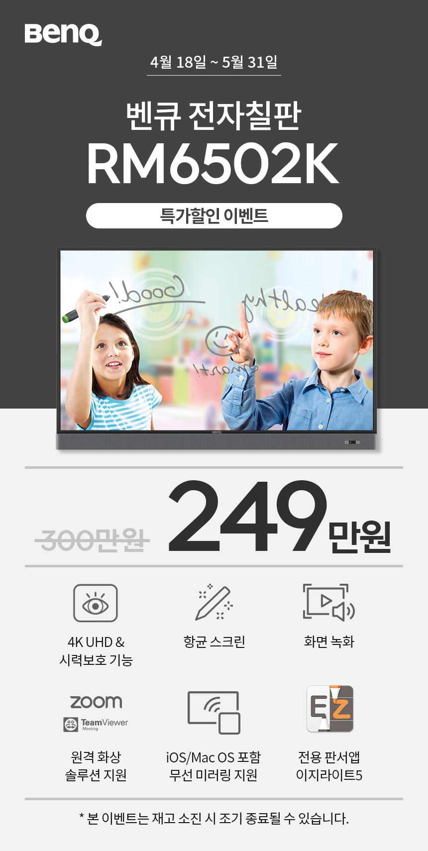 À̹ø Çà»ç´Â 4¿ù 19ÀϺÎÅÍ 5¿ù 31ÀϱîÁö ÁøÇàµÇ¸ç, ÀüÀÚÄ¥ÆÇ RM½Ã¸®ÁîÀÇ 65ÀÎÄ¡ ¸ðµ¨ RM6502K¸¦ ±âÁ¸ 300¸¸¿ø ´ëºñ 17% ÇÒÀÎµÈ 249¸¸¿ø¿¡ Á¦°øÇÑ´Ù. º¥Å¥´Â Ç×±Õ ½ºÅ©¸°, ½Ã·Âº¸È£ ±â´É°ú °°Àº °Ç°ÇÑ ÇнÀ ȯ°æ Á¶¼ºÀ» À§ÇÑ ±â´ÉÀ» Á¦°øÇÏ´Â ÀüÀÚÄ¥ÆÇÀ» Àû¿ëÇÑ ½Ã¼³À» ´ë»óÀ¸·Î ÀÎÁõ ¸¶Å©¿Í ÇÔ²² µ¶ÀÚÀûÀÎ »çÈÄ °ü¸®¸¦ Á¦°øÇÏ´Â ¡®Å¬·¡½º·ëÄɾî¢â ÀÎÁõ ÇÁ·Î±×·¥À» ¿î¿µÇϰí ÀÖ´Ù. Áö³ 3¿ù ±âÁØ ÇØ´ç ÀÎÁõ ÇÁ·Î±×·¥ °¡¸ÍÁ¡ÀÌ 200È£Á¡À» µ¹ÆÄÇß°í, ÇöÀç ¾à 230È£Á¡À» µ¹ÆÄÇÏ¸ç ¼ºÀå¼¼¸¦ À¯ÁöÇϰí ÀÖ´Ù.