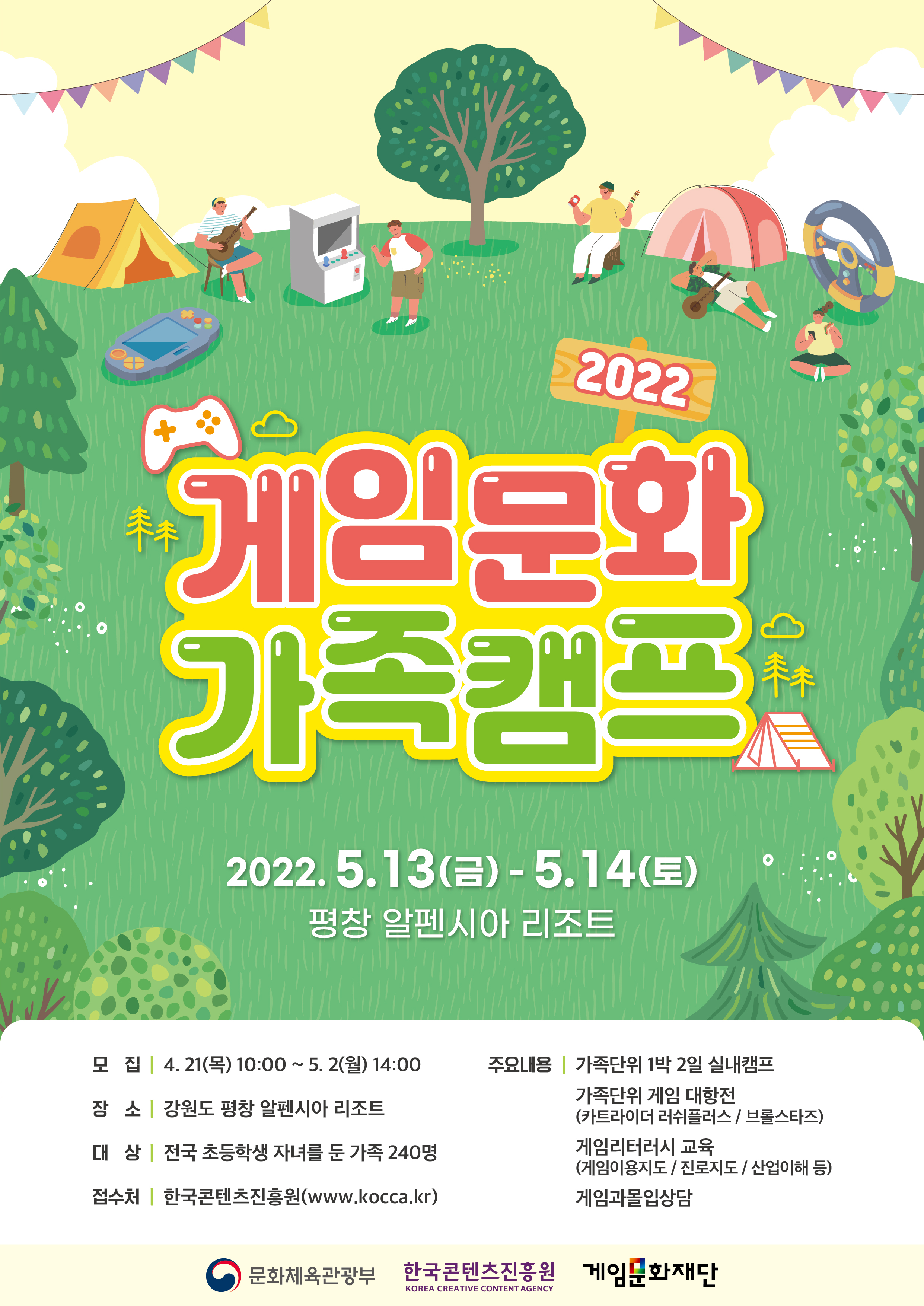 ¹®ÈüÀ°°ü±¤ºÎ, Çѱ¹ÄÜÅÙÃ÷ÁøÈï¿ø, °ÔÀÓ¹®ÈÀç´ÜÀº °ÇÀüÇÑ °ÔÀÓ¹®È È®»êÀ» À§ÇØ °¡Á· Âü¿©Çü ÇÁ·Î±×·¥ÀÎ ¡®2022 °ÔÀÓ¹®È °¡Á·Ä·ÇÁ(ÀÌÇÏ Ä·ÇÁ)¡¯¸¦ ¿î¿µÇÑ´Ù. Ä·ÇÁ´Â Àü±¹ ÃʵîÇлý ÀÚ³à(1~6Çгâ)¸¦ µÐ °¡Á·À» ´ë»óÀ¸·Î, ÃÑ 1,000¸í(ȸÂ÷º° ÃÖ´ë 200¸í, 5ȸ)À» ÃÊ´ëÇÑ´Ù.