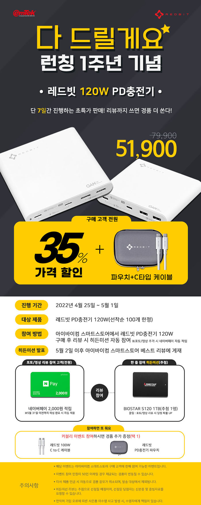 [ÀÌ¿¥ÅØ] Ãʰí¼Ó PDÃæÀü±â 120W ·±Äª 1Áֳ⠱â³ä 35% Ư°¡ À̺¥Æ® ÁøÇà |
