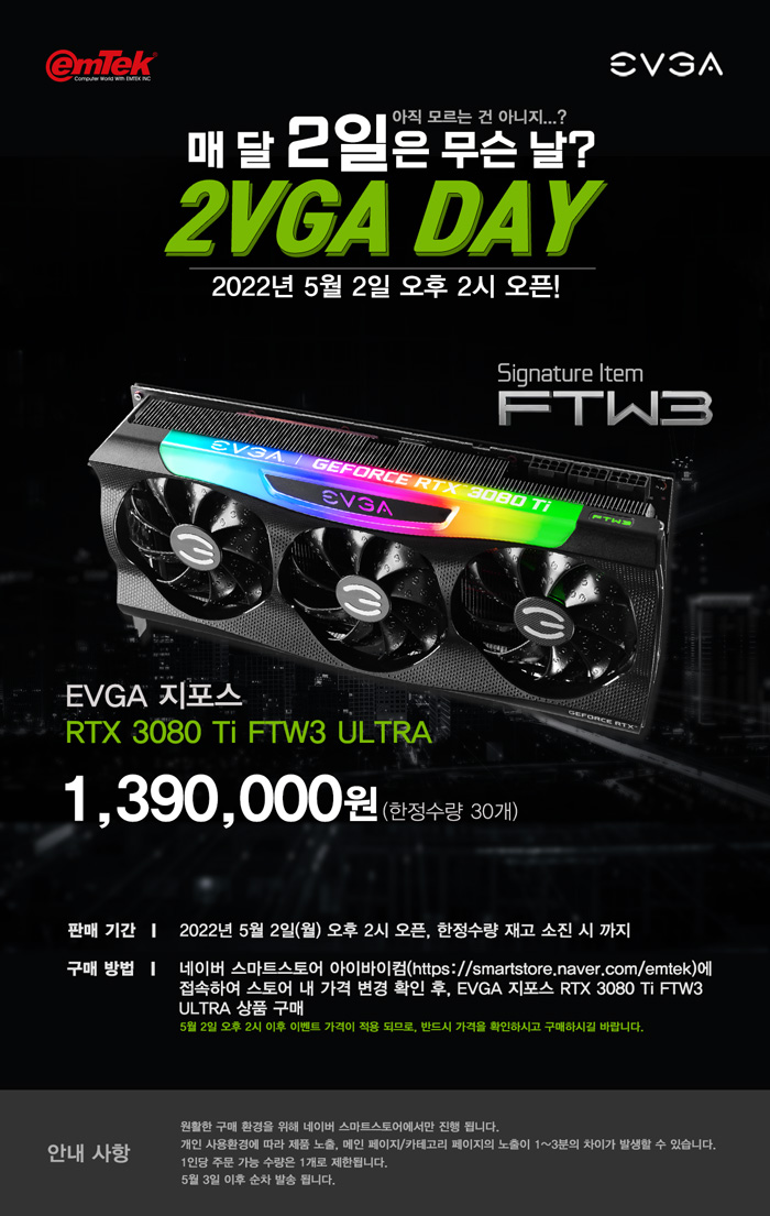 ÀÌ¿¥ÅؾÆÀÌ¿£¾¾´Â 2022³â 5¿ù 2ÀÏ(¿ù) 2VGA DAY¸¦ ¸ÂÀÌÇÏ¿© EVGA ÁöÆ÷½º RTX 3080 Ti FTW3 ULTRA¸¦ ÇÑÁ¤¼ö·® 30°³·Î 139¸¸¿ø¿¡ Ư°¡ ÆÇ¸ÅÇÑ´Ù ¹àÇû´Ù.