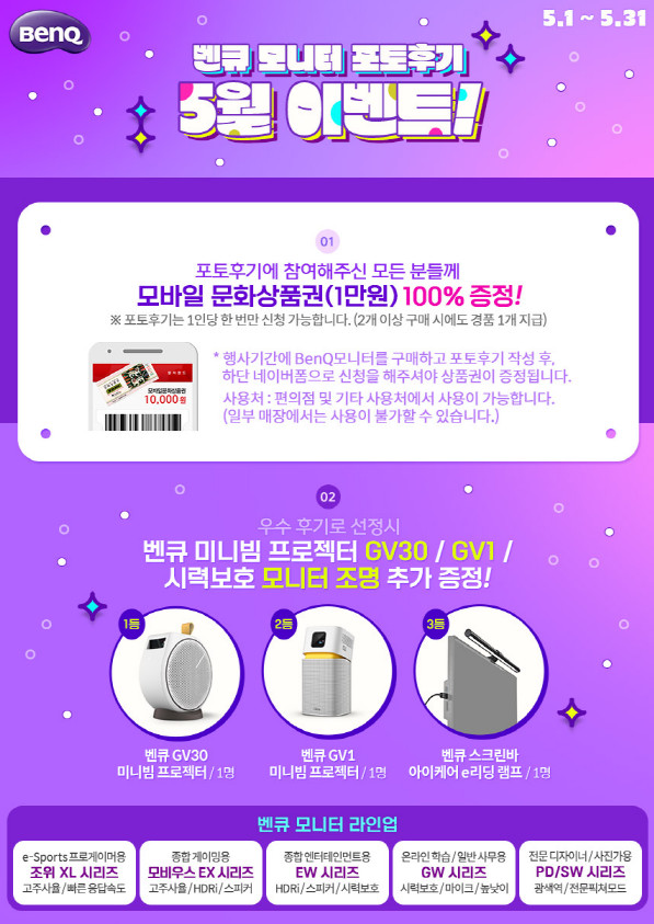 5¿ù °¡Á¤ÀÇ ´ÞÀ» ¸ÂÀÌÇÏ¿© ÁøÇàµÇ´Â Æ÷ÅäÈıâ À̺¥Æ®´Â º¥Å¥ ¸ð´ÏÅ͸¦ ±¸ÀÔÇÏ°í »çÁøÀ» Æ÷ÇÔÇÑ ±¸¸ÅÈı⸦ ÀÛ¼ºÇÑ ºÐµé¿¡°Ô ¸ð¹ÙÀÏ ¹®È»óǰ±Ç(1¸¸¿ø±Ç)À» ¸ðµÎ ÁõÁ¤Çϰí, ¿ì¼öÈıâÀÚ 3¸íÀ» ¼±Á¤ÇÏ¿© Ä·ÇÎ ½ÃÁð Çʼö ¾ÆÀÌÅÛÀÎ º¥Å¥ ¹Ì´Ïºö ÇÁ·ÎÁ§ÅÍ GV30, GV1°ú ´«ÀÌ ÆíÇÑ ¸ð´ÏÅÍÁ¶¸í ¡®º¥Å¥ ½ºÅ©¸°¹Ù ¾ÆÀÌÄɾî e¸®µù ·¥ÇÁ¡¯¸¦ Ãß°¡·Î ÁõÁ¤ÇÏ´Â Çà»çÀÌ´Ù.