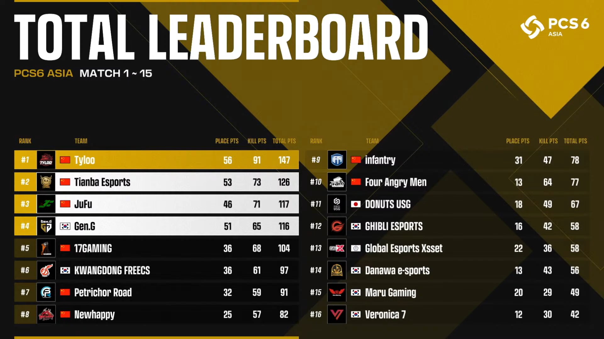 4¿ù 29ÀÏ(±Ý)ºÎÅÍ 3ÀÏ °£ ÁøÇàµÈ PCS6 ¾Æ½Ã¾Æ 1ÁÖ Â÷¿¡¼´Â Áß±¹ ÆÀÀÌ °¼¼¸¦ º¸¿´´Ù. Áß±¹ÀÇ Tyloo´Â 91ųÀ̶ó´Â ¾ÐµµÀûÀÎ ±â·ÏÀ» ¼¼¿ì¸ç ÃÑÇÕ 147Æ÷ÀÎÆ®·Î 1À§¸¦ Â÷ÁöÇß´Ù. Tyloo´Â 2ÀÏ Â÷±îÁö ´Ü ÇϳªÀÇ Ä¡Å²µµ ¾òÁö ¸øÇßÁö¸¸, 60ųÀ» ±â·ÏÇϸç Gen.G(Á¨Áö)¸¦ Á¦Ä¡°í ¼±µÎ¿¡ ¿Ã¶ú´Ù. 3ÀÏ Â÷¿¡´Â 2ġŲ, 56Æ÷ÀÎÆ®¸¦ Ãß°¡ÇÑ Tyloo´Â 2À§ ÆÀ°ú 21Æ÷ÀÎÆ® Â÷À̸¦ ±â·ÏÇϸç 1À§ ÀÚ¸®¸¦ °ø°íÈ÷ Çß´Ù.