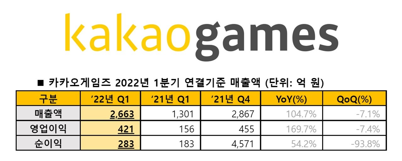 [īī¿À°ÔÀÓÁî] 2022³â 1ºÐ±â ¸ÅÃâ Àü³â µ¿±â ´ëºñ 105% Áõ°¡, 2,663¾ï ¿ø ´Þ¼º |
