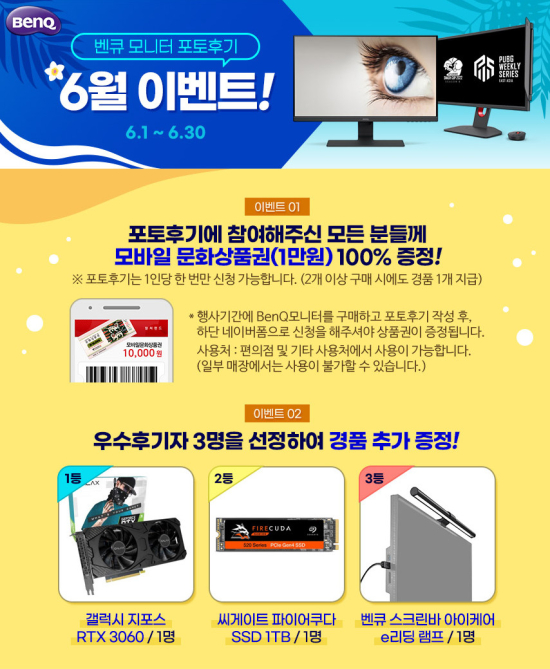 6¿ù ÇÑ ´Þ °£ ÁøÇàµÇ´Â Æ÷ÅäÈıâ À̺¥Æ®´Â º¥Å¥ ¸ð´ÏÅ͸¦ ±¸ÀÔÇÏ°í »çÁøÀ» Æ÷ÇÔÇÑ ±¸¸ÅÈı⸦ ÀÛ¼ºÇÑ ºÐµé¿¡°Ô ¸ð¹ÙÀÏ ¹®È»óǰ±Ç(1¸¸¿ø±Ç)À» ¸ðµÎ ÁõÁ¤Çϰí, ¿ì¼öÈıâÀÚ 3¸íÀ» ¼±Á¤ÇÏ¿© °¶·°½Ã ÁöÆ÷½º RTX3060 ±×·¡ÇÈÄ«µå¿Í ¾¾°ÔÀÌÆ® ÆÄÀ̾îÄí´Ù SSD (1TB), ´«ÀÌ ÆíÇÑ ¸ð´ÏÅÍÁ¶¸í ¡®º¥Å¥ ½ºÅ©¸°¹Ù ¾ÆÀÌÄɾî e¸®µù ·¥ÇÁ¡¯¸¦ Ãß°¡·Î ÁõÁ¤ÇÏ´Â Çà»çÀÌ´Ù.