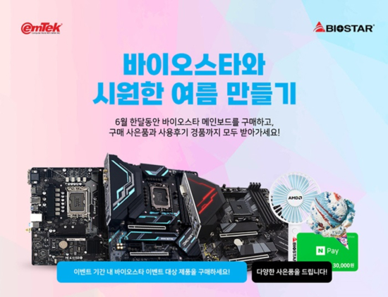 ÀÌ¿¥ÅؾÆÀÌ¿£¾¾´Â 2022³â 6¿ù 1ÀϺÎÅÍ 6¿ù 30ÀϱîÁö ¹ÙÀÌ¿À½ºÅ¸ ·¹ÀÌ½Ì Z690GTA, B660GTQ ¿Í, ¹ÙÀÌ¿À½ºÅ¸ H610MX-E, H610MH, B660MX-E PRO 5Á¾ÀÇ ÀÎÅÚ CPU¿ë ¸ÞÀκ¸µå¿Í ¹ÙÀÌ¿À½ºÅ¸ ·¹ÀÌ½Ì B550GTQ, B550M SILVER, B550MH 3Á¾ÀÇ AMD CPU¿ë ¸ÞÀκ¸µå¸¦ ´ë»óÀ¸·Î ÇÏ´Â 5¿ù °¡Á¤ÀÇ ´Þ À̺¥Æ®¸¦ ÁøÇàÇÑ´Ù°í ¹àÇû´Ù.