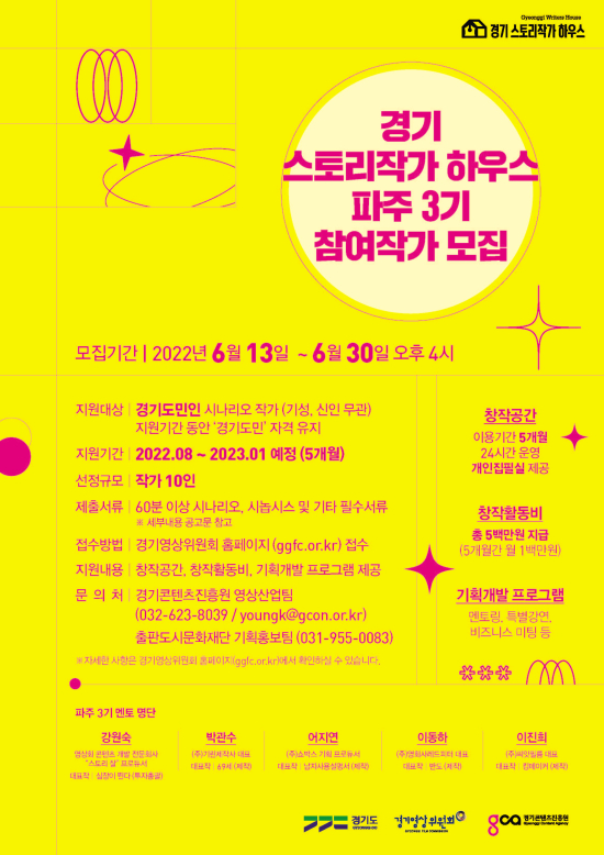 ¡®°æ±â ½ºÅ丮ÀÛ°¡ ÇϿ콺¡¯´Â °æ±âµµ ½Ã³ª¸®¿À ÀÛ°¡ÀÇ ¾ÈÁ¤ÀûÀΠâÀÛȰµ¿À» Áö¿øÇÏ¿© »õ·Ó°í ´Ù¾çÇÑ ¿µÈ­¸¦ ¹ß±¼Çϱâ À§ÇÑ »ç¾÷ÀÌ´Ù. °³ÀÎ ½Ã³ª¸®¿À ÁýÇʰø°£, ¿ù 1¹é¸¸ ¿øÀÇ Ã¢ÀÛÁö¿ø±Ý, ¸àÅ丵 ¹× Àü¹®°¡ Ư°­ µî ´Ù¾çÇÑ ±âȹ°³¹ß Áö¿ø ÇÁ·Î±×·¥À» Á¦°øÇÑ´Ù.