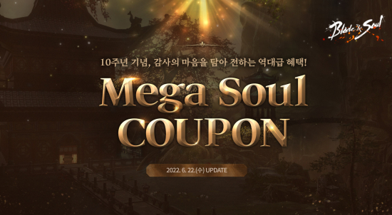 ¿£¾¾(NC)´Â ºí¼ÒÀÇ ¼ºñ½º 10ÁÖ³âÀ» ¸Â¾Æ ¡®Mega Soul¡¯ ÄíÆùÀ» Á¦°øÇÑ´Ù. ÀÌ¿ëÀÚ´Â À̺¥Æ® ÆäÀÌÁö¸¦ ÅëÇØ ¡ãÃÖ»óÀ§ Àå½Å±¸ ¾ÆÀÌÅÛÀÎ ¡®¿©ÀÇ·É¡¯°ú ¡ã°È Àç·á ¾ÆÀÌÅÛÀÎ ¡®È«¹®¼ö °áÁ¤ 300°³¡¯ Áß ¼±ÅÃÇØ ¹ÞÀ» ¼ö ÀÖ´Ù. ¡ã¡®ÃµÇÏ»çÀý ¿ø¼® 4Á¾¡¯µµ ¹Þ´Â´Ù.