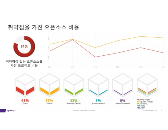 ½Ã³ô½Ã½º(Synopsys, Inc.)´Â ¿À´Ã Àü¼¼°è ¿ÀǼҽº »ç¿ë ÇöȲÀ» ºÐ¼®ÇÑ ¡®2022 ¿ÀǼҽº º¸¾È°ú ¸®½ºÅ© ºÐ¼®(OSSRA)¡¯ ¿¬·Ê º¸°í¼¸¦ ¹ßÇ¥Çß´Ù. ¿ÃÇØ·Î 7¹øÂ° ¹ß°£µÈ À̹ø º¸°í¼¿¡´Â ±Û·Î¹ú 1À§ OSS ¶óÀ̼±½º °ü¸® ¼Ö·ç¼ÇÀÎ ¡®ºí·¢´ö ¿Àµ÷ ¼ºñ½º(Black Duck Audit Services)¡¯¸¦ ÅëÇØ ½Ç½ÃÇÑ Àü¼¼°è 17°³ »ê¾÷ºÐ¾ßÀÇ 2,400¿©°³ÀÇ Ä¿¸Ó¼È ÄÚµå º£À̽º¿¡ ´ëÇÑ ºÐ¼®ÀÌ ´ã°Ü ÀÖ´Ù. ÀÌ º¸°í¼´Â »óÈ£ ¿¬°áµÈ ¼ÒÇÁÆ®¿þ¾î »ýŰ迡 ´ëÇÑ °³¹ßÀÚµéÀÇ ÀÌÇØ¸¦ µ½°í, °ü¸®µÇÁö ¾Ê´Â ¿ÀǼҽºÀÇ À§Ç輺, º¸¾È Ãë¾àÁ¡, ¿À·¡µÈ ±¸¼º¿ä¼Ò, ¶óÀ̼±½º ÄÄÇöóÀ̾𽺠À̽´¿¡ ´ëÇÑ »ó¼¼ Á¤º¸¸¦ Àü´ÞÇÑ´Ù.