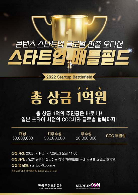 ¹®ÈüÀ°°ü±¤ºÎ¿Í Çѱ¹ÄÜÅÙÃ÷ÁøÈï¿øÀº ¡®2022 ½ºÅ¸Æ®¾÷ÄÜ(Startup:Con, ÀÌÇÏ ½ºÅ¸Æ®¾÷ÄÜ)¡¯¿¡¼ ±¹³» ¿ì¼ö ÄÜÅÙÃ÷ ½ºÅ¸Æ®¾÷ÀÇ ±Û·Î¹ú ÁøÃâÀ» µ½±â À§ÇÑ ¼¹ÙÀ̹ú °æÀïÇÇĪ ¡®¹èƲÇʵ塯¿¡ Âü¿©ÇÒ ½ºÅ¸Æ®¾÷À» ¿À´Â 29ÀϱîÁö ¸ðÁýÇÑ´Ù.